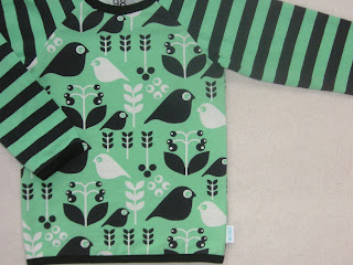 Denna tröjan är sydd i så underbart mjuka tyger från Nosh. Fint motiv är det också med fåglarna, matchande ränder till. Jag valde svarta kantband trots att ränder, fåglar etc är mörkt grafitgrå. Skiljde mer i nyans om jag tog mörkgråa kantband. Syns inte mycket, det ser nästan svart ut alltihop.